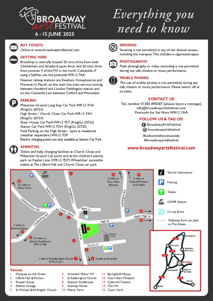 Access: There is good wheelchair access at the Lifford Hall & Parlour, the marquee on the green, Cidermill Theatre and St Eadburgha’s Church. There is wheelchair access at Stanton Guildhouse in the main house and gardens, but not the upstairs artist studio.